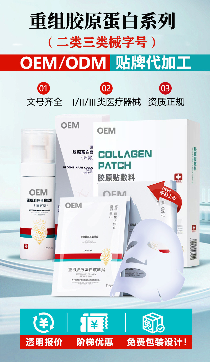 - **医用级敷料定制**:主打二类、三类医疗器械资质的敷料产品,可定制重组胶原蛋白敷料、透明质酸修护敷料、无菌创面敷料等。针对医美术后(微针、激光术后)、皮肤屏障受损、创面护理等场景,调整成分浓度与基质配方,满足**无菌、抗炎、促修复**的核心需求,可定制械字号或妆字号属性,适配院线护理和居家护肤场景。