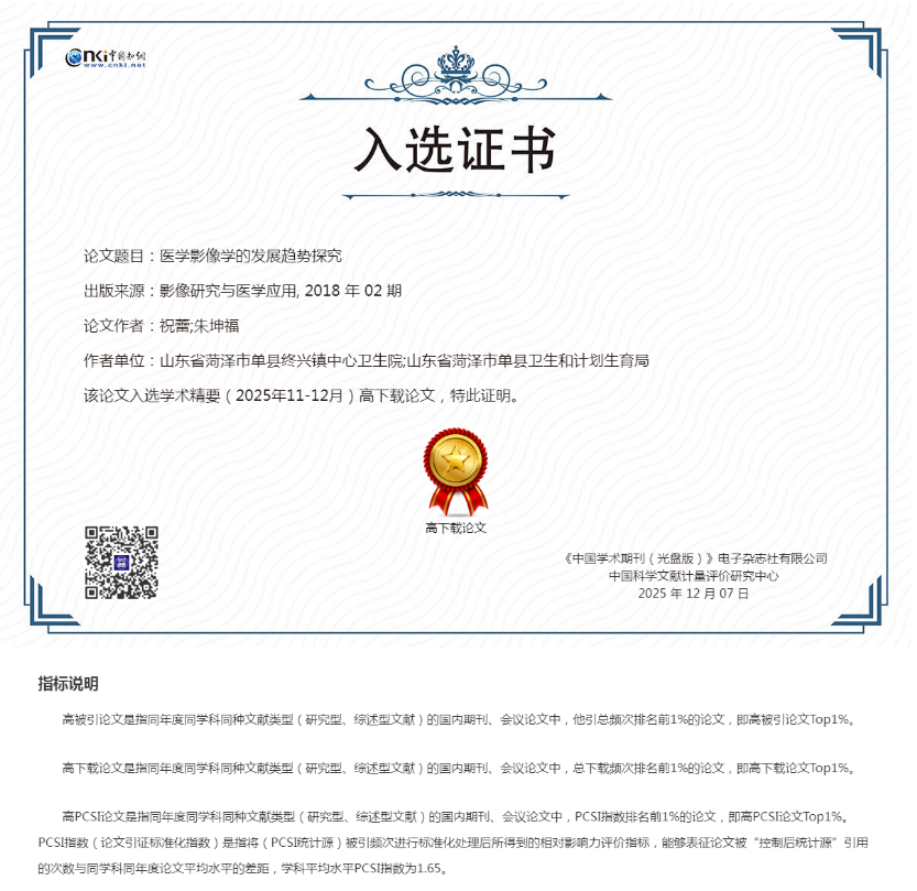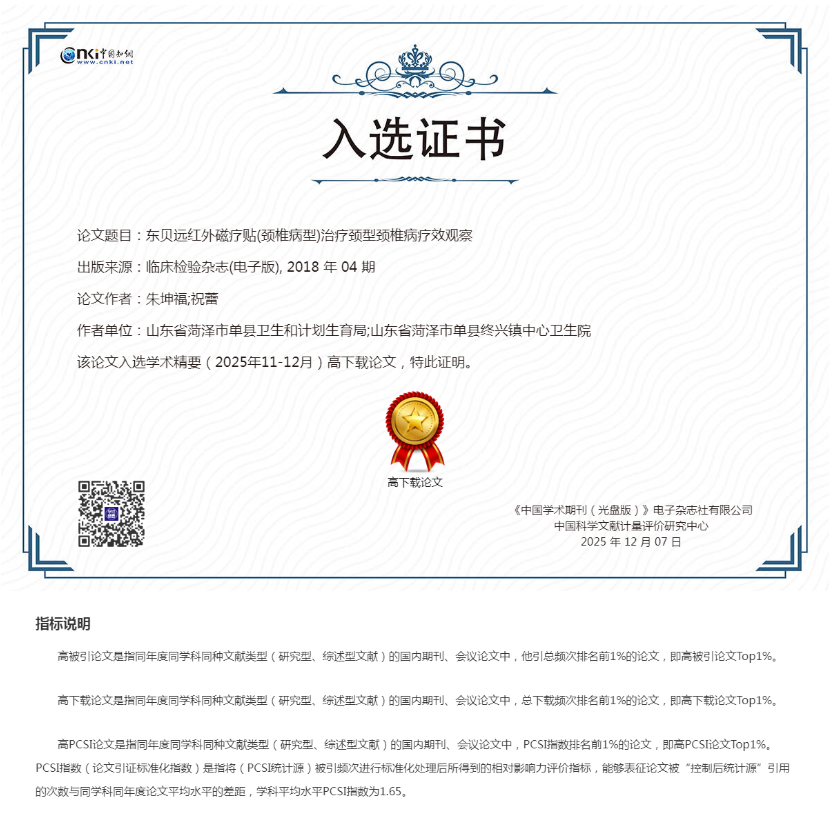 合作成果亮眼:两篇论文跻身 “高下载 Top1% 此次入选高下载论文的两篇合作成果,聚焦医疗技术与临床应用领域:其中《医学影像学的发展趋势探究》刊载于《影像研究与医学应用》;《东贝远红外磁疗贴 (颈椎型治疗颈型颈椎病疗效观察》发表在《临床检验杂志》。而根据证书指标说明,“高下载论文” 是指同年度同学科同类型文献中总下载频次排名前 1% 的成果,此次两篇论文的入选,也直接体现出它们在行业内的高关注度与实用价值。