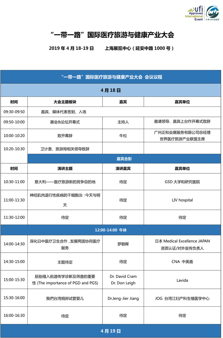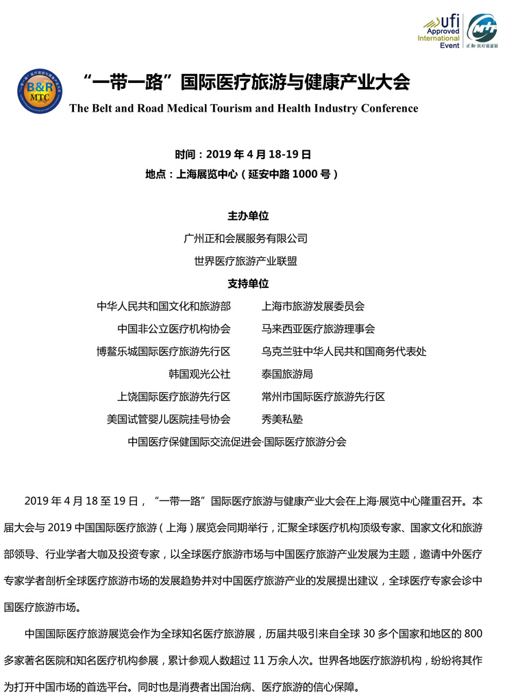 中国国际医疗旅游展,是全球展览业协会ufi认证展览会。2019.4.18-20日,将在上海展览中心盛大开幕。