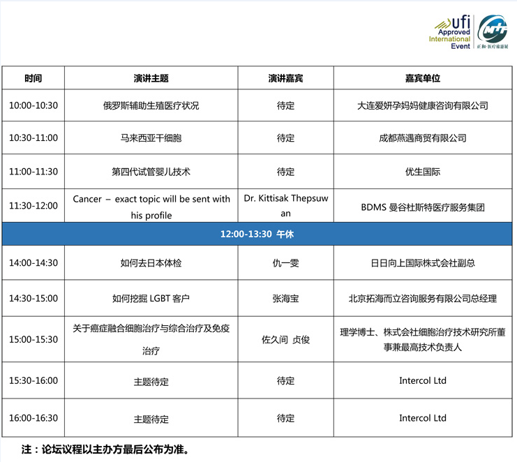 展会同期将举办《“一带一路”国际医疗旅游与健康产业大会》、2018世界医疗旅游产业联盟大会等活动。超过500名中外医疗机构精英专家、国家领导、行业学者大咖及投资专家共聚一堂。放眼全球,为您解读胚胎殖入前遗传学诊断及筛查前沿技术、试管婴儿技术发展和第四代试管婴儿技术、美国冻卵第三方生育、读胚胎殖入前遗传学诊断及筛查前沿技术、试管婴儿技术发展和第四代试管婴儿技术、美国冻卵第三方生育、生物高科技在抗衰中的应用、干细胞在神经-肌肉退行性疾病治疗中的应用、中日韩泰等国医美整形技术发展。