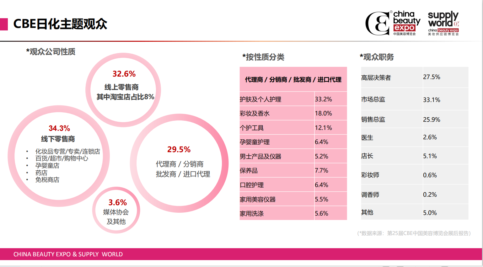 上届CBE数据: 2022年5月12-14日第27届中国美容博览会(CBE)在上海浦东新国际博览中心落幕。为期三天时间,28万平方米的展览面积,25个大馆,超过50个VIP小馆,吸引了全球40个国家3500余家的化妆品企业,10000多个品牌,共享全球创新资源。短短3天,线下汇聚了52.13万人次专业观众,线上影响了超2亿消费人群,再次刷新了中国美容博览会的历史纪录,同时也创造全球美容展的新纪录。