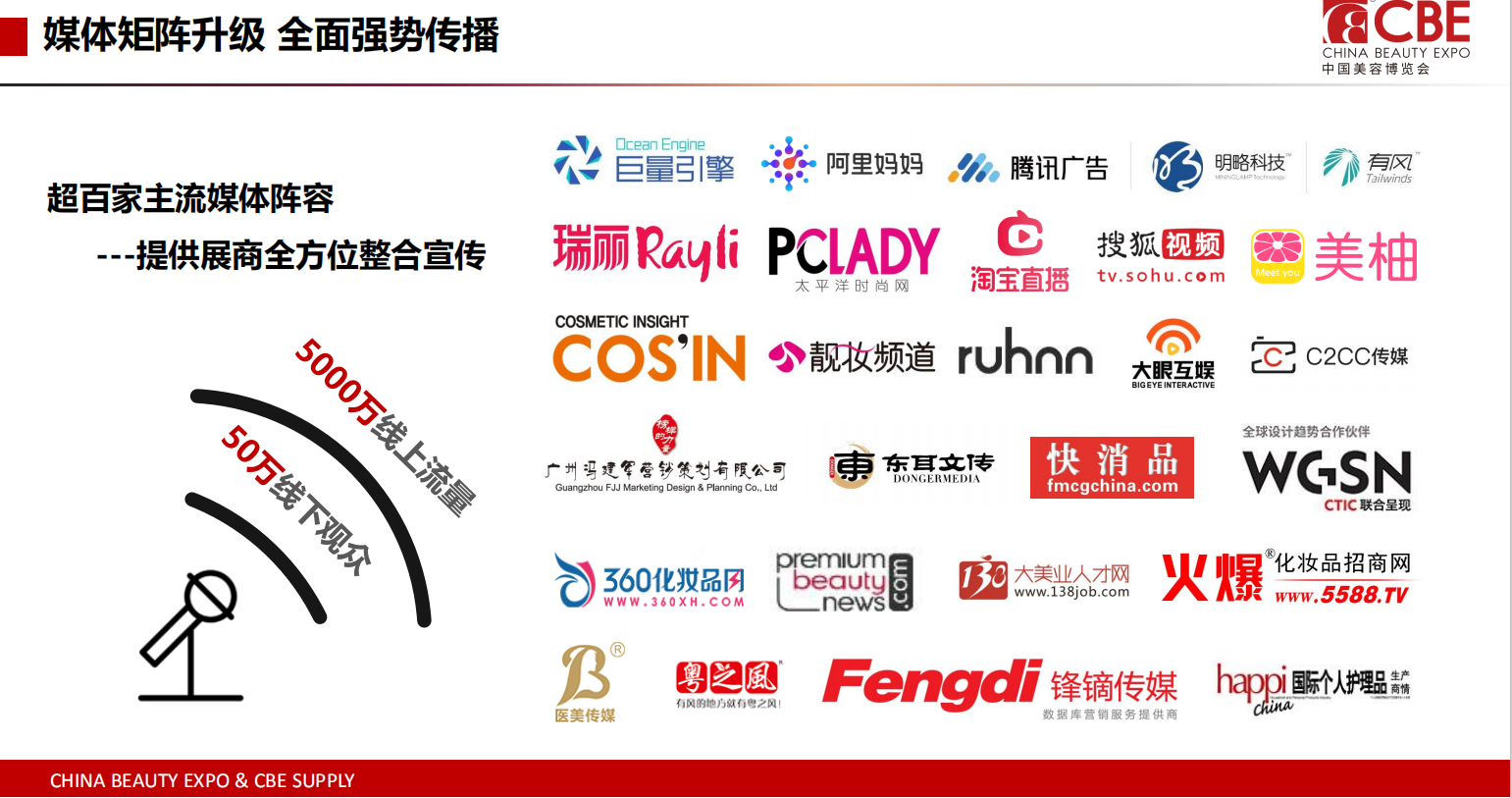 全网媒体矩阵 作为世界百强商展排行榜化妆品类目首位的国际美容展,CBE不仅集结了全球的领先资源,更会引发超大声量的传播,缔造一场规模宏大的媒体盛事。 第27届展会期间,CBE 集结了超百家媒体,形成一个强大的全媒体传播矩阵,除了各主流媒体平台、行业媒体以及大众媒体外,还汇聚了行业专家、意见领袖、KOL等,共同发声,顶配声浪。