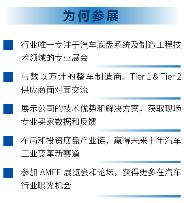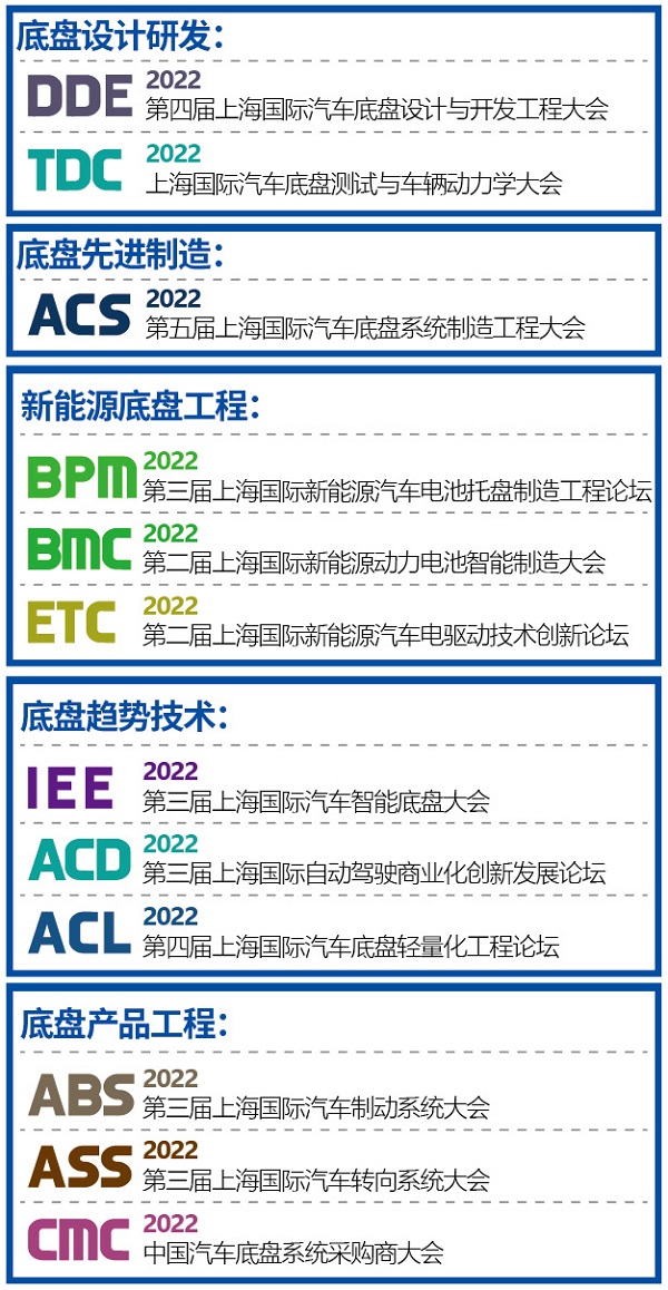 汽车底盘技术旗舰展会 汽车底盘系统设计研发、先进制造、趋势技术、底盘产品工程技术领域行业盛会! 展览时间:2022年11月23-25日 展览地点:上海世博展览馆(上海市浦东新区国展路1099号) 展会数据:17000+平方米、300+ 参展商、150+ 技术会议、22000+ 专业观众 主办单位:ACS Asia亚洲汽车底盘系统产业联盟 Organised by AEE汽车工程会议 米创博隆展览(上海)有限公司 承办单位:米创博隆展览(上海)有限公司 支持单位:中国汽车工程学会汽车转向技术分会 四川省汽车工程学会 广东省汽车工程学会 吉林省汽车工业协会 长三角机器人产业平台创新联盟 ![]() 底盘市场 当今世界,汽车行业成为推动全球经济复苏的一个强劲的引擎,一个充满活力的中国市场正迸发出源源不断的发展动力。随着以技术驱动为核心的产业重塑和以新生代不断涌入、新思潮不断涌现为代表的消费趋势的嬗变,汽车工业技术及汽车作为消费品的内涵和外延正发生着巨大而深刻的变化。 在汽车的大件技术里面,底盘系统技术为重中之重,影响着整车动力性能、安全性能、驾驶性能、舒适性能等。整车制造商对底盘系统研发、设计、新材料应用、制造工艺、产品质量、部件成品、以及底盘趋势技术等供应链提出更高要求,未来,世界汽车工业将走向一个新格局。 展会介绍 AMEE2022上海国际汽车底盘系统与制造工程技术展览会将于2022年11月23-25日在上海世博展览馆举办,预计将有300家全球优秀供应商展示底盘设计与研发、前瞻与趋势、先进制造工艺、产品工程等技术解决方案,展会同期举办12个品牌论坛,近150位来自整车、底盘系统领域的技术专家、教授、供应商代表等嘉宾将出席主题演讲,这是不可过错的行业盛会。 上海国际汽车底盘系统与制造工程技术展览会(简称:AMEE)创办于2018年,是全球汽车底盘工程技术领域的旗帜展览会,AMEE为中国汽车底盘技术创新与持续发展搭建了高质量平台,促进全球汽车制造商综合竞争力的提升,AMEE已成为汽车底盘研发、技术、工艺、采购、质量和管理人员每年必参加的重要活动之一。 为何参展? █ 行业唯一专注于汽车底盘系统及制造工程技术领域的专业展会 █ 与数以万计的整车制造商、 Tier 1 & Tier 2 供应商面对面交流 █ 展示公司的技术优势和解决方案,获取现场专业买家数据和反馈 █ 布局和投资底盘产业链,赢得未来十年汽车工业变革新赛道 █ 参加AMEE展览会和论坛,获得更多在汽车行业曝光机会 ![]() 参展范围 底盘设计研发工程:底盘架构设计开发;底盘总布置工程;性能标定与测试;驾驶模拟、仿真开发;底盘性能开发与调教;测试台架;试制工程;3D打印等。 底盘系统轻量化工程:底盘结构件;副车架轻量化;转向节轻量化;控制臂轻量化;悬架轻量化;轮毂轻量化;扭力梁 / 稳定杆轻量化;发动机轻量化;电机轻量化;电池包上壳体 / 下壳体;高压铸造工艺;低压铸造工艺;重力铸造工艺;挤压成型工艺;半固态压铸技术;一体成型压铸。 商用车底盘工程:商用车底盘设计与开发;商用车底盘智能化与电动化;商用车底盘轻量化;商用车底盘零部件;商用车底盘涂装与表面处理;商用车自动驾驶;商用车智能总装;商用车底盘冲焊。 底盘趋势技术:底盘智能化;底盘电动化;底盘电子化;底盘模块化;自动驾驶;线控制动;线控转向;底盘电子系统;底盘控制技术;底盘系统集成技术;滑板式底盘;轮毂电机。 底盘先进材料工程:铝合金;高强度钢;镁合金;碳纤维;工程塑料;树脂等。 电动汽车底盘工程:CTC一体化电动底盘;电池包及壳体设计与开发;电池包轻量化;电池包上盖及下壳体;BMS电池包管理系统;电池包装配-测试-密封技术。 底盘部件产品工程:制动系统零部件;传动系统零部件;转向系统零部件;悬架系统零部件;三电系统零部件。 底盘部件先进制造工程:底盘部件机加技术;底盘部件焊接技术;底盘部件装配技术;底盘部件冲压技术;底盘系统涂装技术;底盘部件质量检测技术;底盘智能总装工程。 底盘性能测试与开发:操控稳定性测试与开发;行驶平顺性测试与开发;动力性能测试与开发;制动性能测试与开发;转向性能测试与开发;悬架性能测试与开发;总成及关键部件测试与开发;车辆动力学测试与开发;智能驾驶系统的测试开发;疲劳耐久性测试;NVH测试与开发;材料测试。 ![]() 同期会议 AMEE2022展会期间将举办12大品牌150场汽车底盘系列论坛,围绕着汽车底盘设计开发、材料工程、底盘轻量化、底盘测试与车辆动力学、底盘智能化-电子化-电动化、电池箱制造、电驱动集成、线控转向、线控制动、自动驾驶、底盘部件机加工-焊接-装配-冲压-涂装-质量、底盘采购供应链等领域,预计会议注册嘉宾将达到12000人, AMEE汽车底盘系列论坛是全球汽车底盘技术领域规模最大、专业性最强、含金量最高的技术盛会,论坛将吸引150位来自汽车底盘领域技术专家、学者、优秀供应商等嘉宾发表主题演讲。 底盘设计研发:DDE 2022第四届上海国际汽车底盘设计与开发工程大会 TDC 2022上海国际汽车底盘测试与车辆动力学大会 底盘先进制造:ACS 2022第五届上海国际汽车底盘系统制造工程大会 新能源底盘工程:BPM 2022第三届上海国际新能源汽车电池托盘制造工程论坛 BMC 2022第二届上海国际新能源动力电池智能制造大会 ETC 2022第二届上海国际新能源汽车电驱动技术创新论坛 底盘趋势技术:IEE 2022第三届上海国际汽