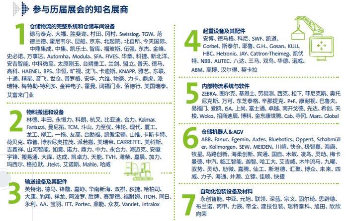 参与历届展会的知名展商 1、仓储物流的完整系统和仓储车间设备:德马泰克,大福,胜斐迩,村田,冈村,Swisslog,TGW,范德兰德,昆船,北起院,北自所,今天国际,中鼎集成,鼎虎,中集,科陆,SFA,FIVES,华章等 2、物料搬运和设备:林德,丰田,永恒力,科朗,小松,Kalmar,Fantuzzi,OM,曼尼拓,TCM,斗山,力至优,伟轮,现代,合力,杭叉,比亚迪,夏工,龙工,柳工,一拖,友高等 3、输送设备及其配件:英特诺、德马、锋馥、嘉峥、泰富、电气、哈栢司、三铃工机、大康、ITOH、同日、永利、阿波罗、AA、宝羽、ITT、Potyec、鼎能、众友等 4、起重设备及其配件:安博、德马格、科尼、SWF、凯道、Gorbel、斯泰尔、耶鲁、G.H 、Gosan、Kuli、HBC、Hetronic、Jay、Cattron-Theimeg、凯伏特、NBB、AUTEC、八达,三马等 5、内部物流系统与软件:ZEBRA,图尔克、东芝泰格、P+F,康耐视、巴鲁夫、易福门、爱欧,ISA,上尚,富士通,卓越,南开戈德,先达,希创,天梭,Wolco,招商迪辰,博科等。 6、仓储机器人&AGV:ABB、Fanuc、Egemin、Axter、Bluebotics、Oppent、Schabmuller、Kollmorgen、SEW、MEID、EN、快仓,极智嘉、海康、怡丰、艾瑞思、斯坦德、佳顺、南江、锦明、哈工大、牧星、木牛流马、厚达、嘉腾、仙知、博众、未来、迦智、马路创新等 7、自动化包装设备及材料:永创智能,中亚,元旭、深蓝、宗义、固尔琦、思辟德、布兰诺、力辰等