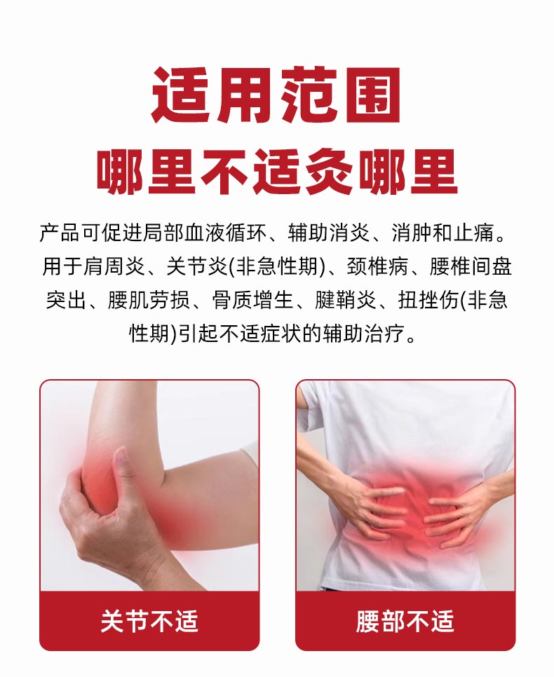 该产品可促进局部血液循环、辅助消炎、消肿和止痛。用于肩周炎、关节炎(非急性期)、颈椎病、腰椎问盘突出、腰肌劳损、骨质增生、腱鞘炎、扭挫伤(非急性期)引起不适症状的辅助治疗。
