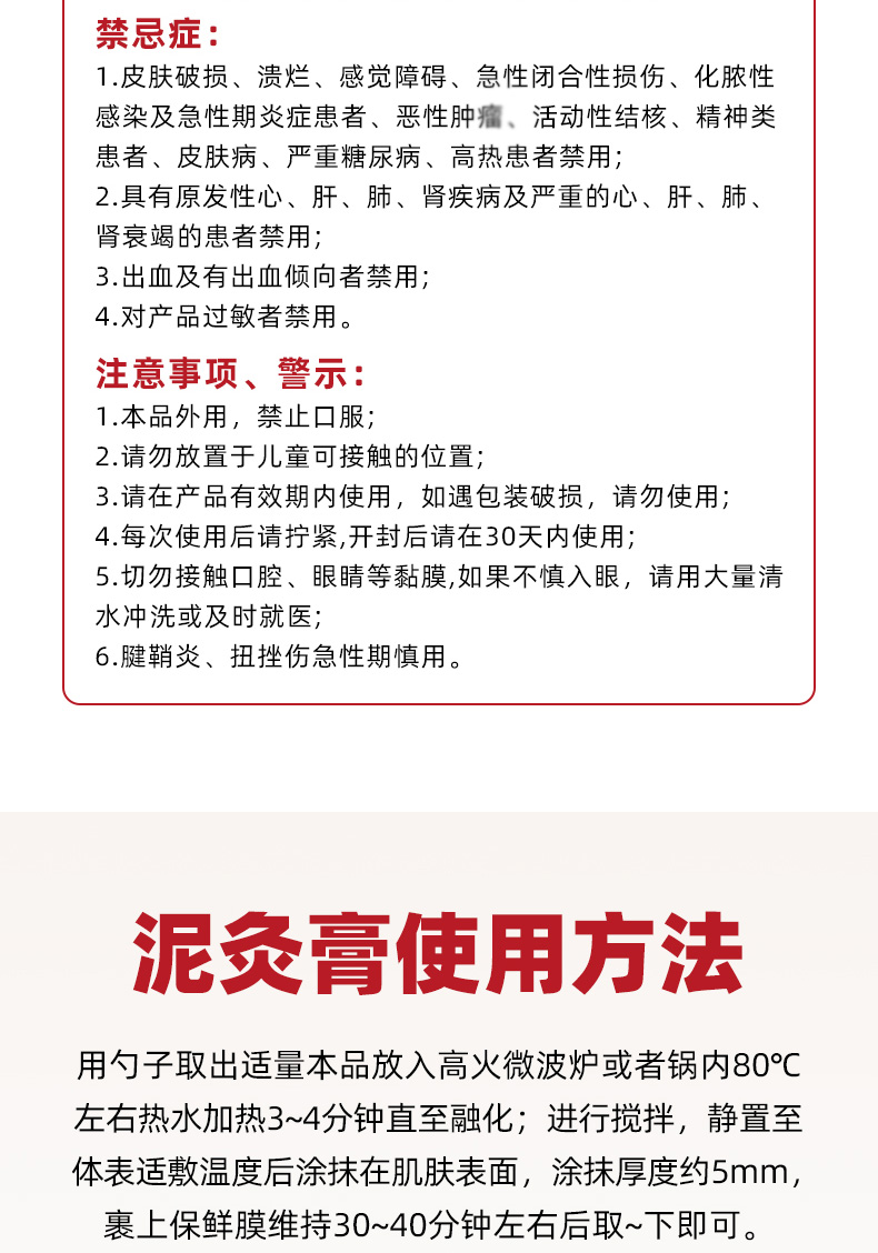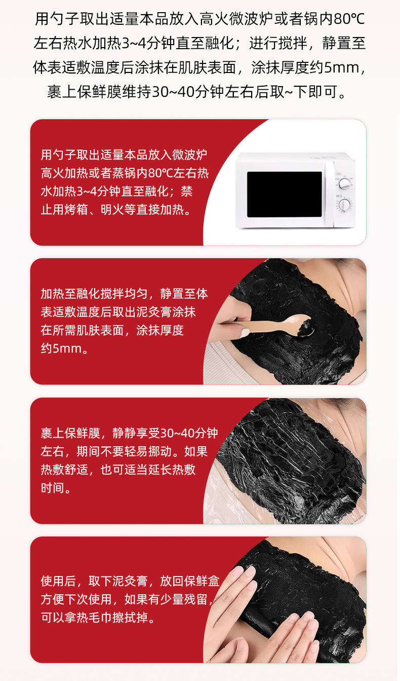 【使用说明】:用勺子取出适量本品放入高火微波炉或者锅内80度左右热水加热3~4分钟直至融化,进行搅拌,静置至体表适敷温度后涂抹在肌肤表面,涂抹厚度约5mm,裹上保鲜膜维持30~40分钟左右后取下即可。
