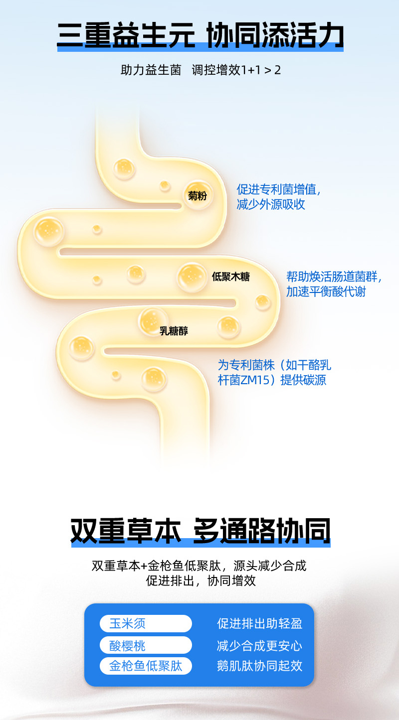 【配 料 表】乳糖醇、低聚木糖(食用量S3.0克/天添加量25%)、菊粉(食用量≤15克/天添加量21%)、玉米须粉、酸樱桃粉、乳酸菌粉(麦芽糊精、干酪乳酪杆菌ZM15发酵粘液乳杆菌ZM05、鼠李糖乳酪杆菌ZM18、罗伊氏粘液乳杆菌ZM122)、金枪鱼低聚肽粉