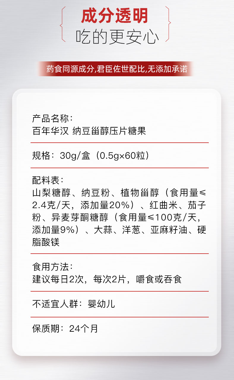 【配料表】山梨糖醇、纳豆粉、植物甾醇(食用量≤2.4克/天,添加量20%)、红曲米、茄子粉、异麦芽酮糖醇(食用量≤100克/天,添加量9%)、大蒜、洋葱、亚麻籽油、硬脂酸镁。