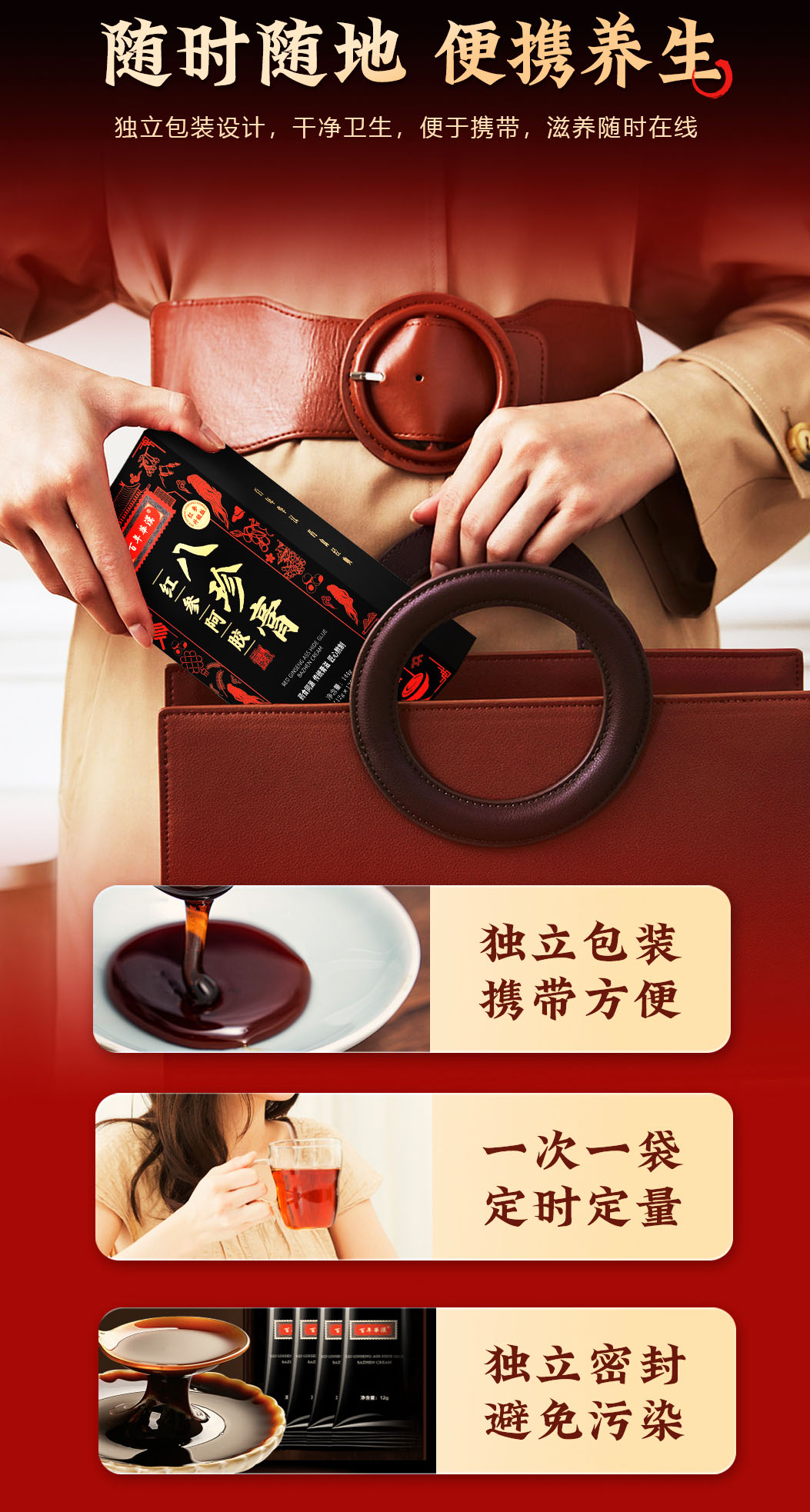 【主要原料】蜂蜜、红糖粉、红枣速溶粉、桂圆粉、黄芪粉(使用量≤9 克/天,添加量6.67%)、枸杞粉、红参浓缩液(人工种植,人参食用量≤3克/天,添加量2%)、酸枣仁粉、薏苡仁粉、阿胶速溶粉、党参粉(使用量<9 克/天,添加量1.64%)、茯苓粉、重瓣玫瑰花粉