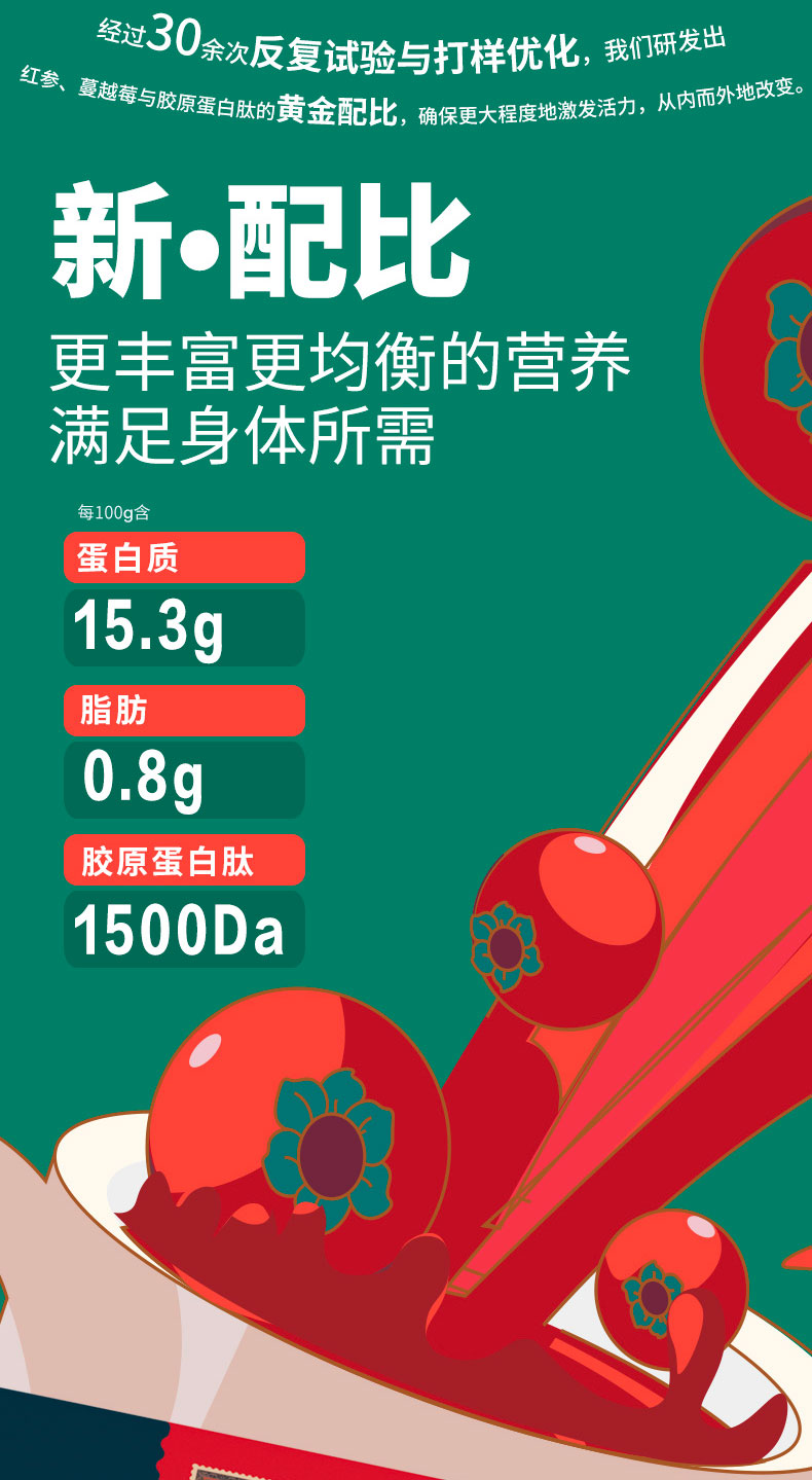 配料表藓糖醇、鱼胶原蛋白肽、低聚果糖菊粉(添加量10%、食用量15克/天)、蔓越莓粉、玫瑰茄冻干粉、红参粉(人工种植,添加量1%、食用量3克/天)、壳寡糖(添加量0.2%、食用量0.5克/天)、综合果蔬酵素粉、瓜尔胶、维生素C、柠檬酸、柠檬酸钠、甜菊糖苷、三氯蔗糖、二氧化硅。