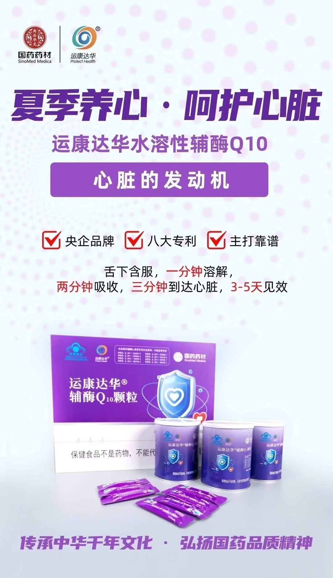 运康达华辅酶Q10,每袋含量高达48毫克。水油双吸,服用方便24小时守护“心”时代。天然微生物发酵,科学提取,安全无负担央企品牌,八大专利,权威认证,舌下含服,一分钟溶解,两分钟吸收,三分钟到达心脏,3-5天见效